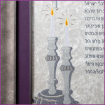 Traditionally, candle-lighting time at the onset of Shabbos and Yom Tov is a special time for women’s supplications to God for blessing for the family, for good life, for compassion and salvation, for wise and learned children who love and fear God. This design captures both the words of the traditional blessing and prayer, as well as the candlesticks that shine from the artwork with rays of light, and sparkle with hand-sewn gems.